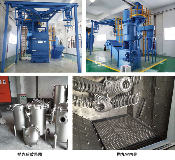 室体采用全封闭结构,无弹丸飞溅现象,室内采用耐磨合金铸铁护板防护。