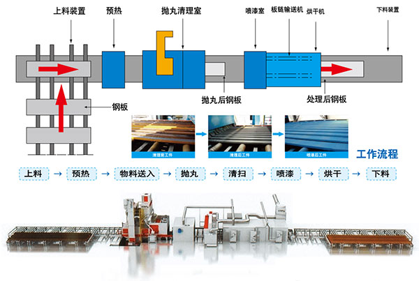 本设备为高效率连续作业钢材预处理生产线。钢材通过辊道经预热后送进抛丸清理室,